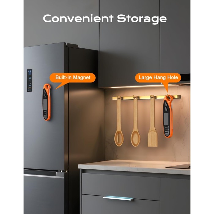 - 【Easy to Read】Our food thermometer features a large 1.8-inch backlit LCD screen and temp lock function by pressing the “HOLD” button, allowing you to easily read the temperature whether you're grilling in the dark or baking in the kitchen. It's the perfect grilling accessory and kitchen essentials